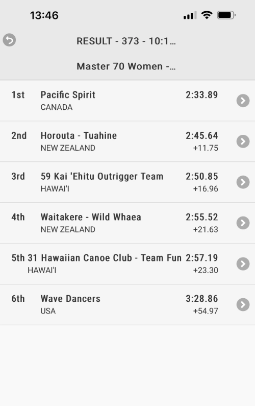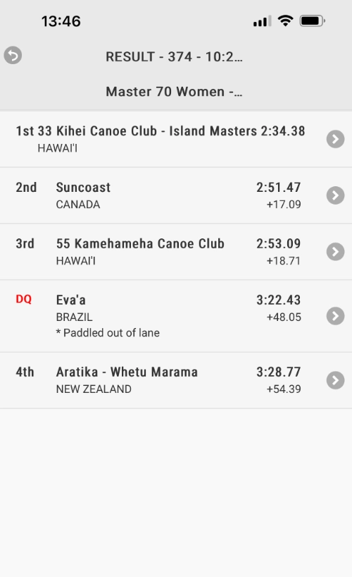 Loading into the waka was again a bit troublesome even though they were able to turn the waka sideways for the first time. I caught my leg under the seat and am now looking for the arnica. We were one of the first waka to load out and had a relaxed run up to the end. Penny got us beautifully positioned to make our approach for the white flag to the start line. There was a bit of raruraru in the lanes next to us. Our crew has done a fantastic job of keeping our heads in our waka right from warm up to finish. There is a lot of chatter all around us but we don’t get pulled into it.