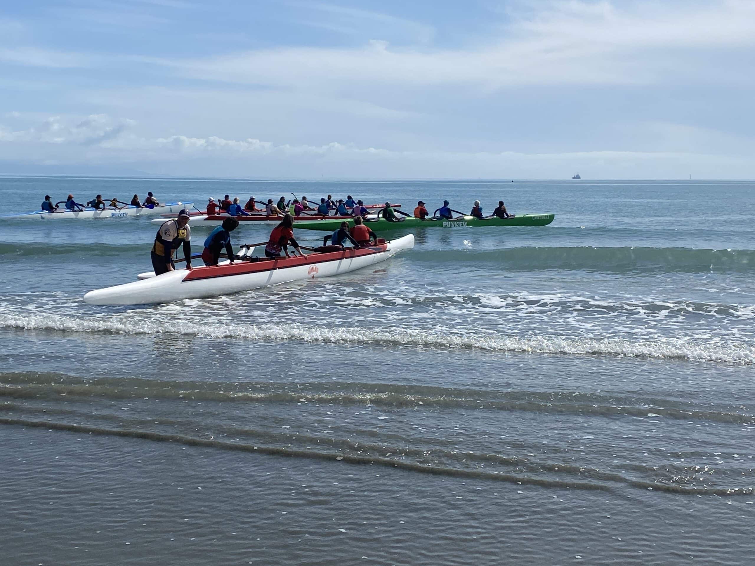 Launching waka at Tahunanui